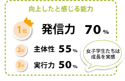 高専女子フォーラムに参加した女子学生たちに、フォーラムに参加したことで向上したと感じる「社会人基礎力」(経済産業省が提唱)について、アンケート調査を行いました。大部分の学生がフォーラムの参加で何らかの能力の向上を実感しています。特に、70%の学生が、発信力の向上を実感。主体性の向上55%、実行力の向上50%と高い値でした。