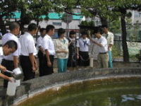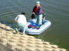| H16年度 卒業研究 印篭池の水質調査 毎月1回ため池の水質調査を実施しています。土日に作業ご苦労様でした。[1AC磯野、5C小野田、難波そして海道くん] |