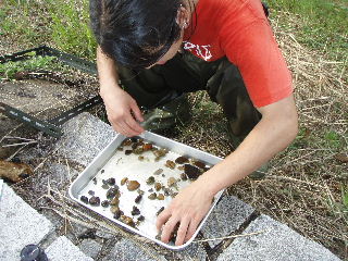 | 喜瀬川調査 9月17日 喜瀬川の環境調査。今年から始めた底生生物調査で採取した水生昆虫の分類にはまだまだ時間がかかります。 |