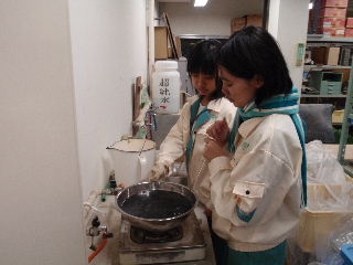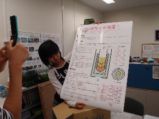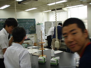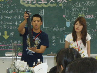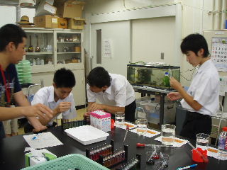 | オープンキャンパス 8月21〜22日 学生が先生となって水質測定の模擬授業をしました。中学生の皆さんも真剣に取り組んでくれました。暑い中ご苦労様でした。 |