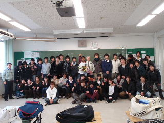 | 終業式後のクラス写真 2月24日 4年生の最終日です。インターンシップなど初めての試みなどいろいろとありましたが、なんとか乗り切ることができました。 来年は乗り切れる自信が・・・・ |