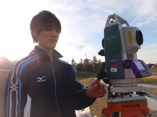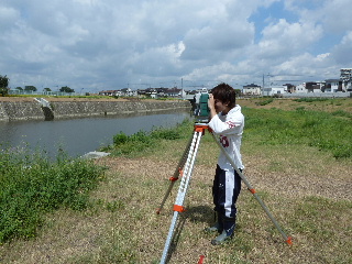 | 河川地形測量 9月16日 喜瀬川北河原井堰が魚類の生息環境に及ぼす影響についてシミュレーションをするための、地形測量を行いました。トータルステーションは便利ですね、3人でさくさく作業できました。 |