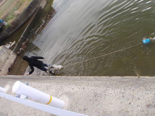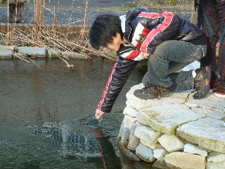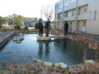 | 4年生工学演習 1月11日から 卒研の導入教育である4年生の工学演習です。今日は学内の池のBOD測定をしますが・・・寒い、池に氷が張っている。 |
