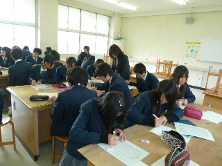 | 出前講座 11月16日 中学校の出前講座に出かけてきました。生徒さんもいつもと違った90分という長時間の内容でしたが、真剣な表情で聞いてくれ、たくさんの質問をしてくれました。出前講座は、新しい情報を探したり、分かりやすい資料作り、飽きさせないような工夫、演習課題等を試したりと私自身にとって良い刺激になるのでこれからも機会があればどんどん行いたいと思いました・・・って同じ内容のコメントを以前も書いた気が・・・ともあれ、野々池中学校の3年6組みの生徒さん、真剣に聞いてくれたありがとう! |