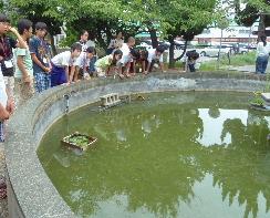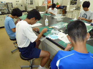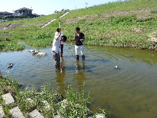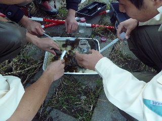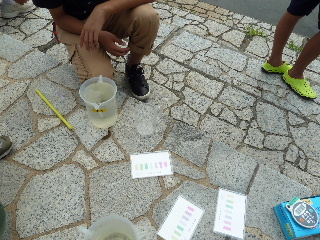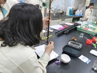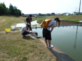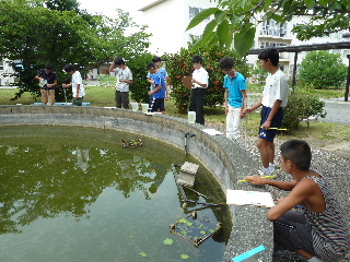 | 公開講座「身近な水辺環境を調べてみよう!」 7月30日(火) 公開講座「身近な水辺環境を調べてみよう!」を実施しました。受講者の諸事情で参加者が9名と少なかったですが、その分じっくりと学習や作業ができた気がします。各自工夫をしながら透視度計を作成し、暑い中身近な池や水路の水質測定を行いました。アンケートでは、自分で作った道具で観測することができ良かったと言ってくれるひとが多かったです。また、夏休みの自由研究にもなるということで好評でした。 |