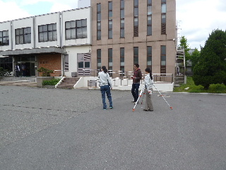 | 実験と測量 5月1日(水) 5年生の工学実験Vの様子と、学内敷地の水準測量の様子です。測量はエコランの練習コースである学内敷地の高低差を調べるために行ったもので、高い所と低い所では1mの差がありました。ちょっとした驚きです。 |
