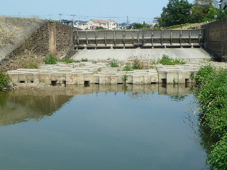 | 喜瀬川環境調査 5月27日(月) 農繁期に入り喜瀬川の水がせき止められています。大きな降雨がない限り堰は起立したままです。今回は堰を越流する流れはなく、堰直下のエリアは水たまりとなっていました。 |