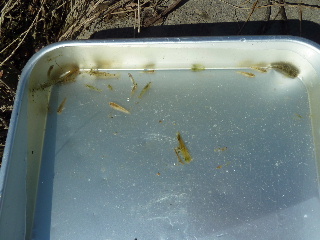 | 喜瀬川環境調査 7月8日(月) 6月に引き続き週末にまとまった雨が降ったのですが、相変わらず川には水が流れていません。底生生物の出現種も変化ありませんが、ヨシノボリが増えてきました。暑いので時間を設定して休憩しながら調査しないと、熱中症が心配です。 |