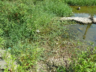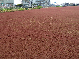 | 喜瀬川環境調査 8月21日(水) 喜瀬川の8月調査です。堰直下は水はありますがまったく流れていませんでした。真っ赤な地面の写真は、ため池の水面いっぱいに広がったアカウキクサです。 |