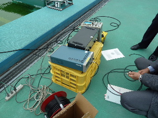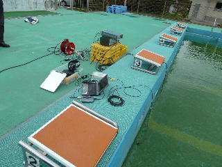 | 水中音響実験 10月18日 NIRO(新産業創造研究機構)の助言を受け、水中音響実験をプールで行いました。準備はしていたつもりですが、なかなか上手くいかないものです。研究とはこの繰り返しです・・・分かってはいるけど、1回で終わらしたいものです。 |