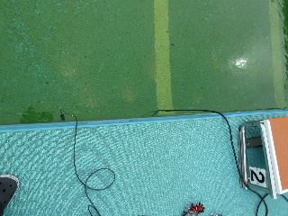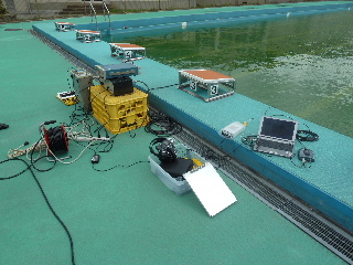 | 水中音響実験2 11月11日 前回の失敗を修正し再びトライ!ほぼ成功と言える成果を得ることができたと信じています。プール横の幹線道路を通過する車両の振動が結構大きかったことに驚きました。 |