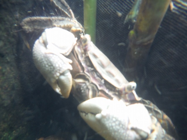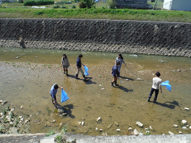 | 養田川の環境調査 7月28日(木) 竹炭を用いた水質浄化実験を行っている養田川の環境調査です。ザリガニ、カニがたくさん見えました。 |