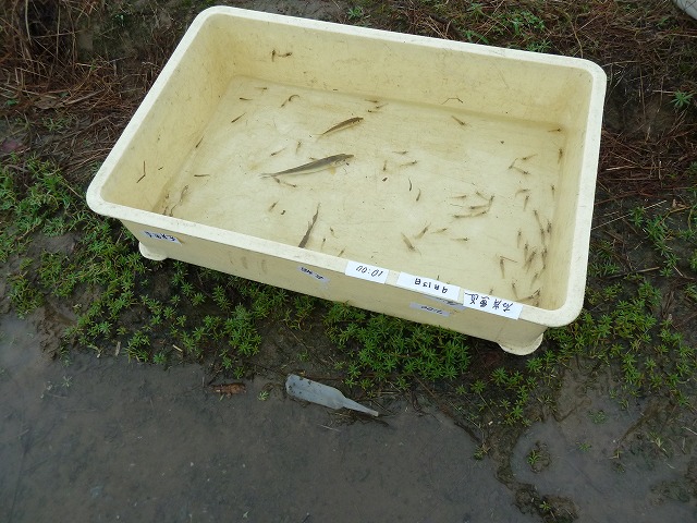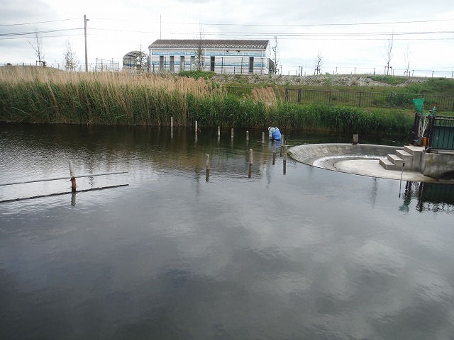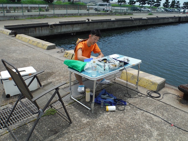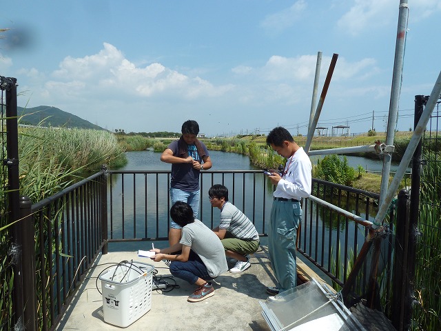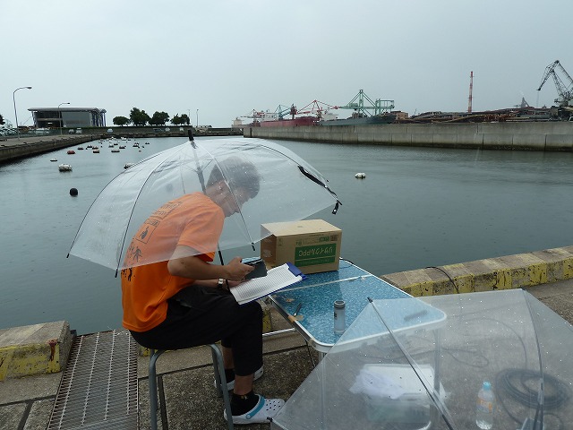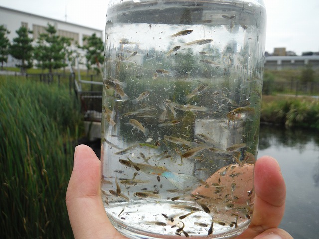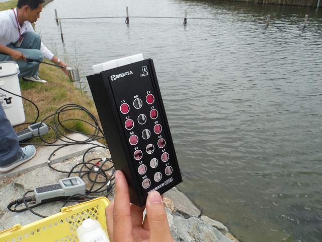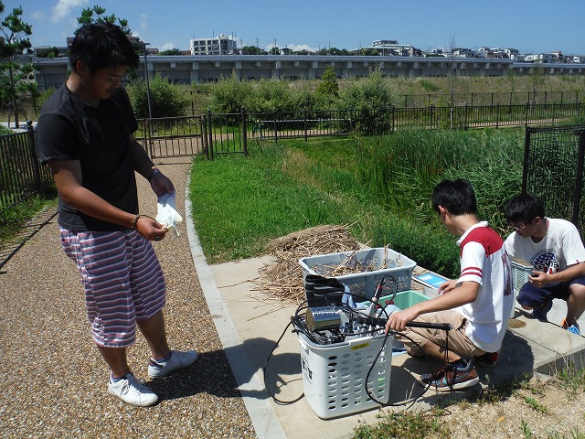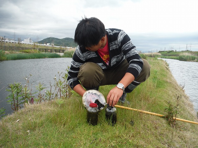 | 修景池調査 9月14日(水) 午前:インターンシップ先巡回、コンサルタンツで実習中のY君が、加古川大堰の魚道の遡上調査中にお邪魔した。学生時代を思い出しました。 午後:テッポウエビ類の2時間連続補足調査、2時間調査したところで雨が降ってきました、ぎりぎりセーフです |