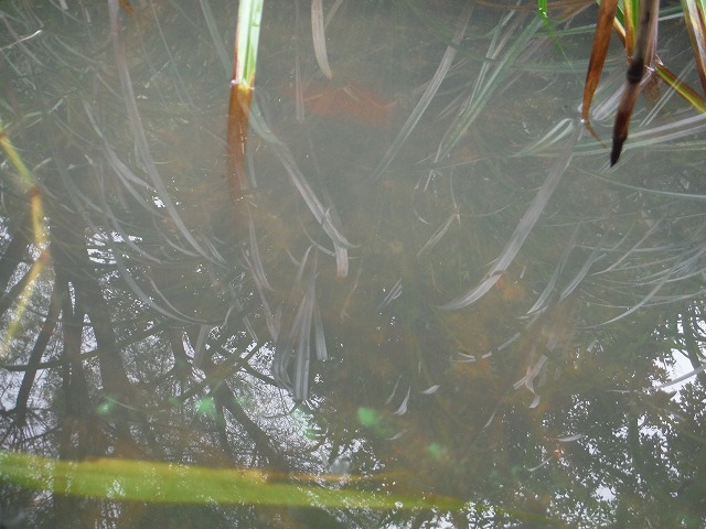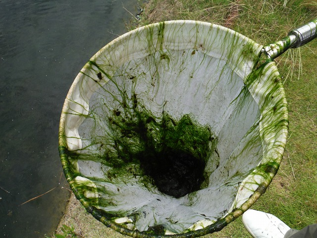 | 垂水修景池 7月6日(水) 去年とは違った藻(アオミドロ)が発生している。 |