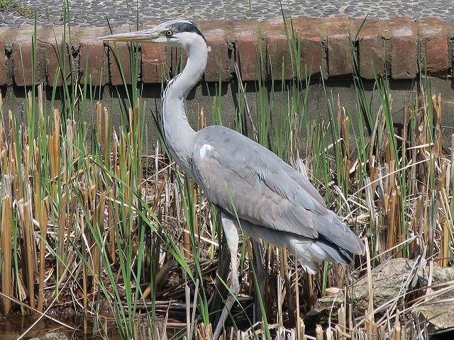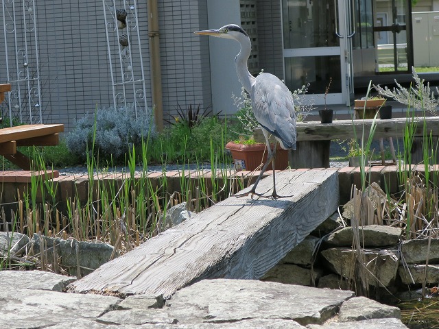 | 中庭ビオトープ 4月19日(火) 学内の中庭ビオトープに大きなアオサギが羽を休めていました。小さな池ですが、周辺のビオロープの一部として機能していると改めて感じた一瞬でした。 |