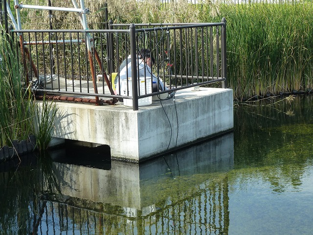 | 垂水修景池調査 10月12日 今月も藻類の発生が見られず。藻類増殖抑制実験用の藻が手に入らないため、工学実験Vに引き続き不安。水中にはカダヤシ、ネオンテトラがうようよ、こいつらが何かしたのか? |