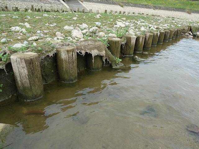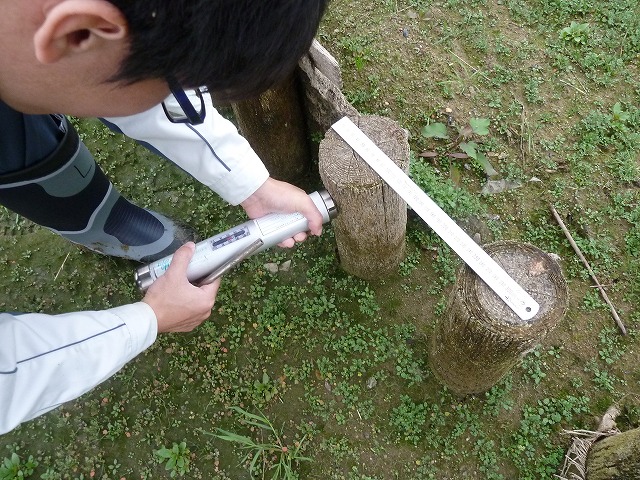 | 喜瀬川調査 11月21日 2年ぶりの喜瀬川です。当時の水質と魚類の調査とは違い、木杭の不朽状態を確認する調査です。長い年月を掛け木杭の表面の特徴が分からなくなり、測定が思ったより難航しました。 |