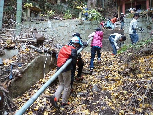 | 竹林保全活動 11月23日 午前は子供たちと竹の切り出しと掃除をし、午後は高齢者福祉施設で切り出した竹を使った竹細工と地域密着の活動でした。家、学校以外でも子供の世話をするとは思いませんでした。活動が落ち着いたところで学生と烏原貯水池まで足を延ばしてきました。烏原貯水池は明治38年に完成し、大正3年の拡張工事で現在の姿になったそうです。紅葉、減勢工、うすの石積み見どころがたくさんあったのですが時間がなくわずかな滞在となり残念、また、上流の石井ダムも含めてゆっくりと訪れてみたいと思います。このあたりから見る神戸市内の景色もなかなかいい感じです。 |
