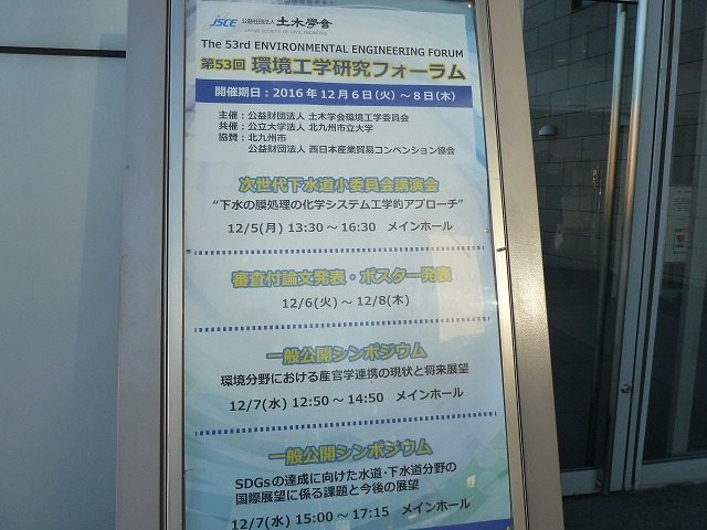 | 環境工学研究フォーラム 12月6〜8日 北九州で開催された学会に参加してきました。一般公開シンポジウムでは、ミレニアム開発目標(MDGs)から持続可能な開発目標(SDGs)へ引き継がれ、その目標達成のための水道・下水道分野の役割について最新の動向を知ることができました。別のテーマでは研究活動と社会との乖離、研究成果をどう社会に実装していくのかなどについても議論された他、研究発表でも質疑に加え、第一線で活躍される先生による総括がされ、全体的に若干敷居の高く感じられました。しかし、少しハードルの高い所で頑張るのもいいかなと感じたところです。懐かしい友人とも会えたり、合間にゼンリンの地図の資料館(100円、ETC提示で無料)、北九州市立水環境館(無料)を満喫し充実した学会出張となりました。 |