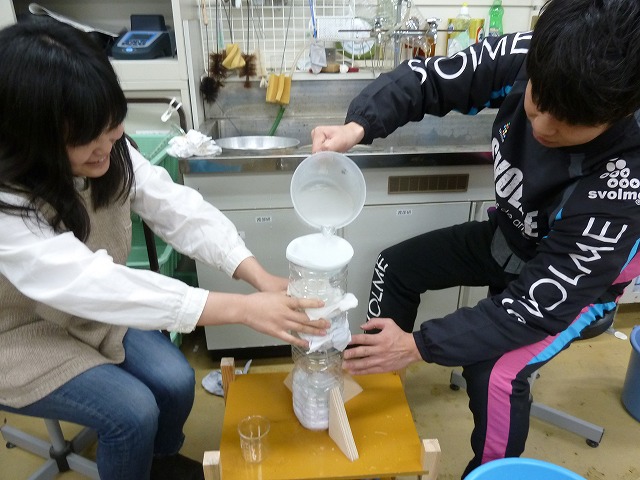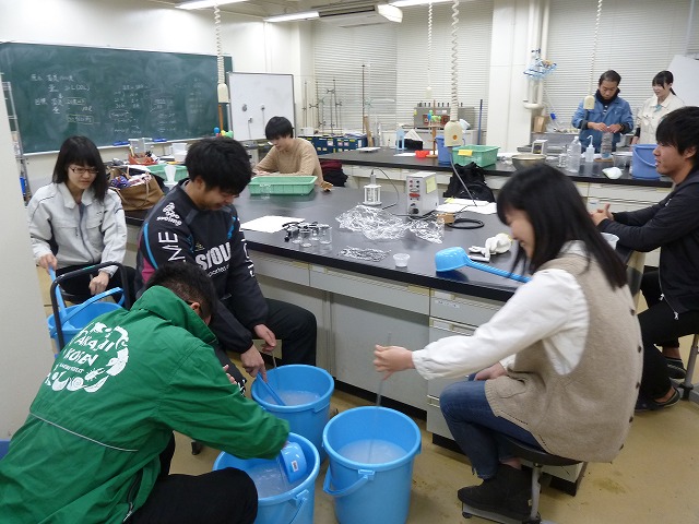 | 創発ゼミナール 本年度の創発ゼミナール担当で、濁水の浄化をテーマにしました。漠然としたテーマを与え作業過程での試行錯誤をしながら学生自身でルール、方法などを決めていく方式です。もう少し時間があれば、さらに踏み込んだ内容となれたと思います。 |