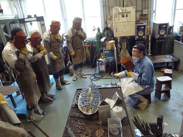 | 溶接実習 10月28日 工学実験Vでは、溶接実習の体験を取り入れています。今週から4週間の予定でガジャマダ大学からきている2人の学生にも体験してもらいました。楽しかったようです! |