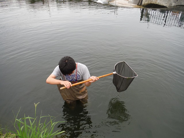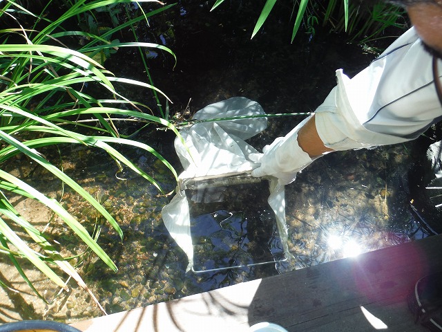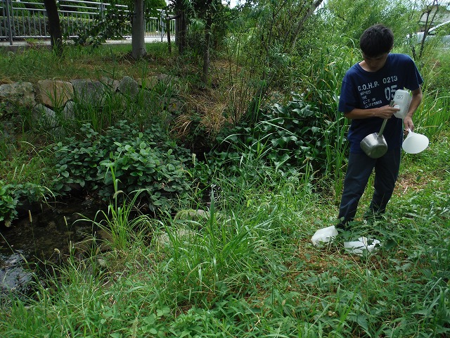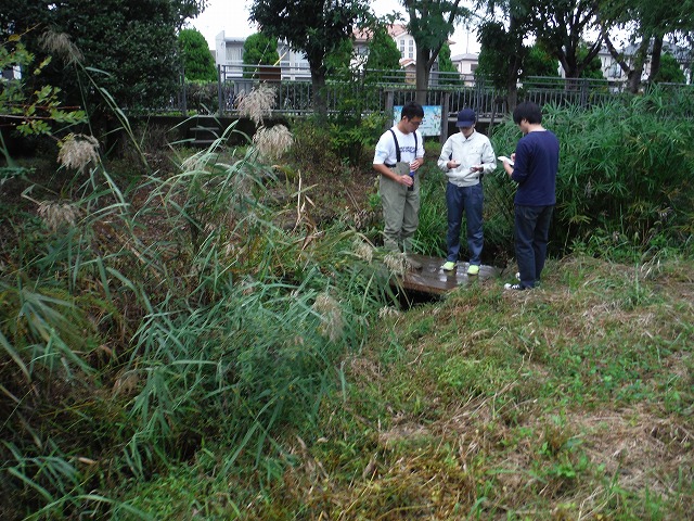 | 養田川調査 6月12日(月) Survey of river / June 12.2017 キレイに除草され調査がしやすくなっていました。公園に来ている人に通報されてしまいました。調査中の看板を作らないとまずいかな? Sings such as "It's under water environmental surveying" are necessary for field survey |