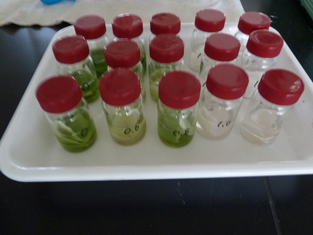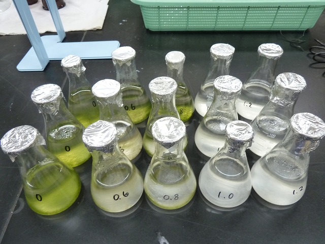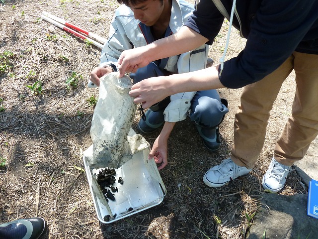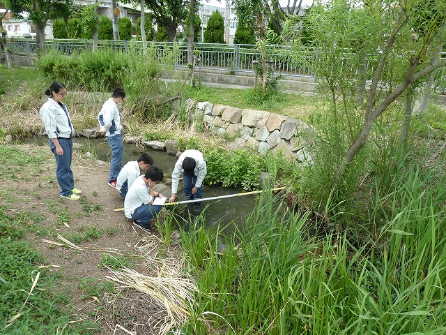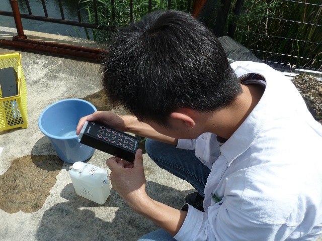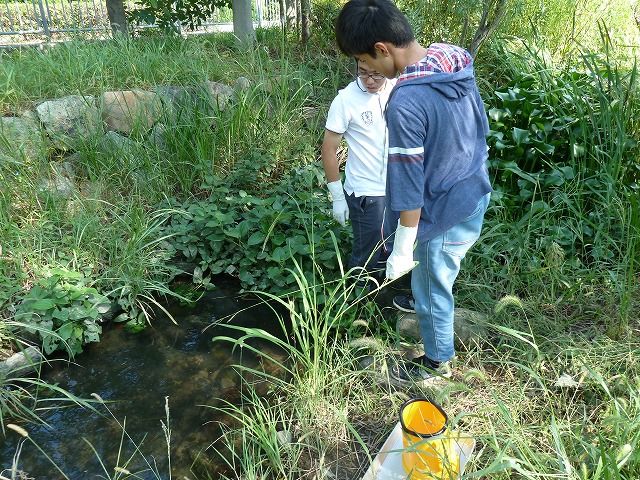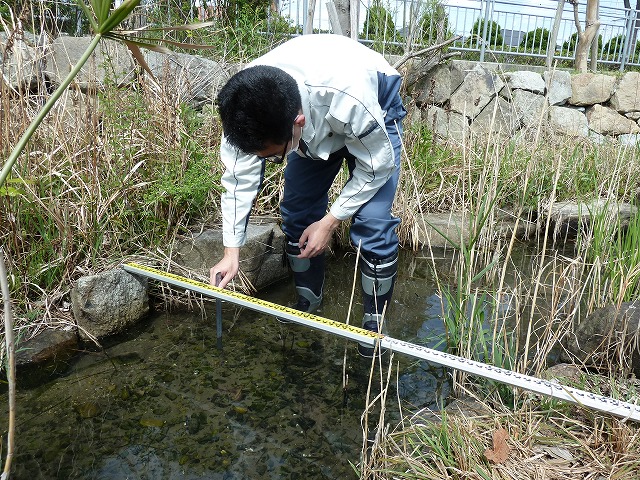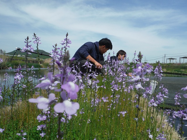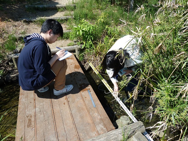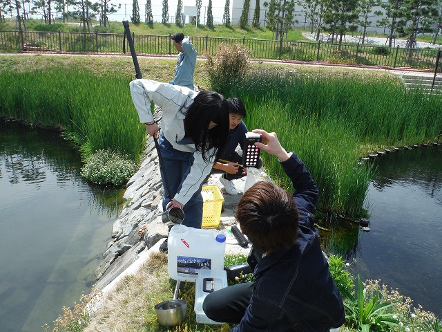 | 垂水修景池 5月2日(火) Survey of pond / May 2.2017 藻類が発生したと伺い急遽調査を行いました。昨年藻類が発生していない状況で、藻類発生問題を取り扱った学生も少しモチベーションが上がったと思います。 This theme is a research on algae occurs in a pond using sewage treatment water. I think the student's motivation has increased by the survey. |