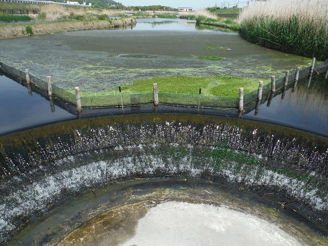 | 垂水修景池 7月10日 Survey of pond / July 10.2017 まだ大量の藻の発生には至っていませんが、アオミドロがちらほら。 This time survey did not found generating a large quantity of algae. |