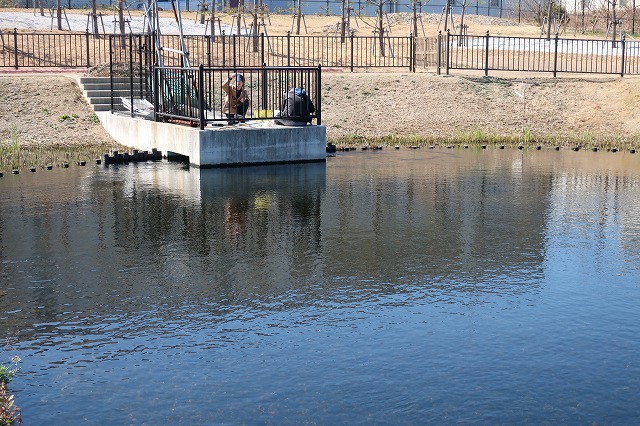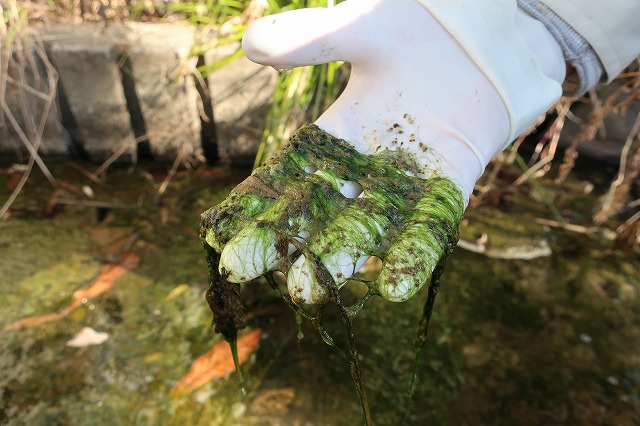 | 垂水修景池 3月6日 Field observation at a scenic pond. March/6/2018 池の水面に藻はありませんでしたが、水底にぎっしりと藻が生えていました。ゆくゆくはちぎれて水面を漂うことが予想されます。 There are nothing on the surface of water. But it is expected to occrre massive algae when we observed to the bottom condition of the water. |