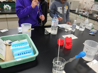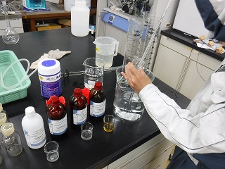 | 実験準備 衛生実験は5年生の前期(4月〜7月)に掛け近隣のため池や水路の水を採水し、水質測定を行っていました。しかし2年前からこの実験を4年生の後期に変更したところ、採水した水が比較的きれいで、透視度、濁度、COD、BODの値が低すぎ問題となっていました。本年度からは測定原理の理解と精度の検証に重点を置いた内容に変えようと日々準備を進めているところです。 |