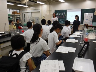 | 公開講座 12月7日(土) 12月7日(土)に中学生向け公開講座「水の性質を調べてみよう!」(参加者3名)を開催しました。少人数でしたので保護者の方にも一緒に参加して頂き、お互いの表情を見ながら楽しく実施することができまた。参加者の皆さんには、実験を通じて水の性質と水質汚濁や私たちとの生活との関わりについて学んでいただけたと思います。 (昨年と同じ文章です) |
