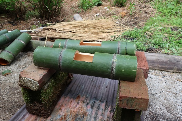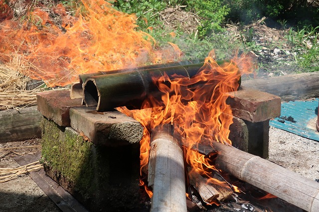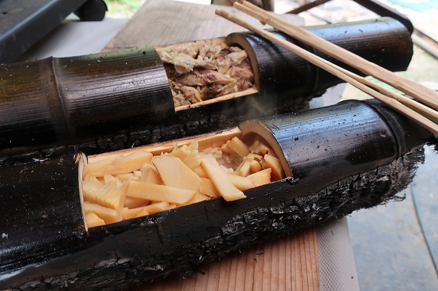 | 番外編 竹炊飯 竹を使った竹炊飯に挑戦、採りたての竹の子を使った竹の子飯とクロダイの鯛めし、大成功でした。 |