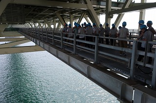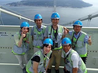 | 明石海峡大橋主塔登頂 7月17日(水) 都市システム工学科にインターンシップとして、インドネシアのペルタミナ大学から来日している学生1名を連れ、令和元年7月17日(水)に明石海峡大橋の主塔登頂イベントに参加しました。このイベントは、土木学会関西支部主催の「ぶら・土木27明石海峡大橋の主塔に登ろう!」で留学生にも対応しています。 受付後、留学生は本州四国連絡高速道路株式会社のビルに移動し、英語版で明石海峡大橋建設のビデオを見て、橋の科学館へ移動し、展示を見たり、VR体験を行いました。その後、日本人参加者と合流し登頂準備をした後、明石大橋の管理道を約1km歩き、エレベーターに乗って海上約300mの登頂に登りました。頂上からの眺望については、是非体験して自分の目で確かめて頂きたいです。 留学生の感想「The view from the top and the path under the bridge, It is so mesmerizing, would love to go back.」でした。将来、友人をつれて戻ってきてください。 梅雨のあいまのつかの間の晴天で、少し暑かったですが貴重な体験ができたと喜んでくれました。 |