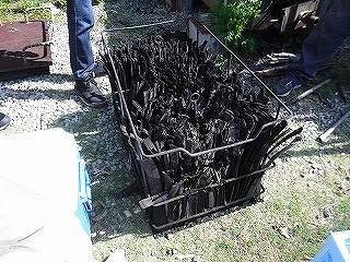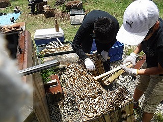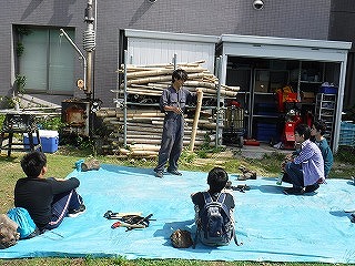 | 公開講座「竹炭づくりを体験しよう!」 6月8日(土)、9日(日) 6月8日(土)、9日(日)に本学科の公開講座「竹炭を作ろう!」を実施しました。 竹は放置すると成長し続け、密集してやがて枯れてしまいます。健全な竹林を維持するには、定期的に間伐することが必要です。この講座では、竹炭づくりを通じて地域の環境問題について考えるという趣旨説明がされた後、作業に入ります。 先ずは間伐された40cm程度の竹を、4から6等分に割り、節をとって窯(炭化装置)にセットします。この作業がとても大変なのですがとても重要な作業です。木を空気中で燃やすと、木の炭素と酸素が結びつき二酸化炭素として放出され、燃え尽きてしまいます。しかし、木を空気のないところで加熱すると、炭素と酸素が結びつかず、水分が抜け炭素分だけが残り、炭素の塊である炭が出来上がります。ですので、できるだけ酸素(空気)が少なくなるよう、密に竹を窯の中に詰め込む必要があるのです。この作業の後、炭化装置に火入れをすると、作業がなくなるので、竹トンボつくりと学科の実験室の見学を行いました。 2〜3時間で加熱は終わるのですが、まだ窯や炭が熱いので本日はここまでとなります。翌日9日に、炭だしの作業をして、出来たての炭と竹酢液を参加者に持って帰っていただきました。暑い中参加してくれた中学生のみなさんありがとうございました。 |