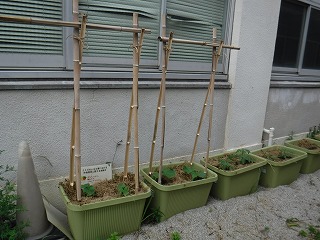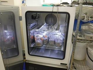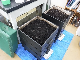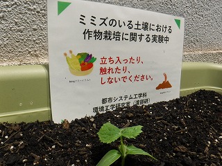 | 実証実験 専攻科、本科卒研生の実験は学生がいないと始まりません。増え続けるミミズに新たなテーマ「ミミズのいる土壌における作物栽培に関する実験」を与えました。収量、糖度に差が出てくるのか実証してみたいと思います。 |