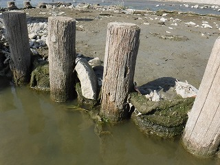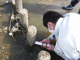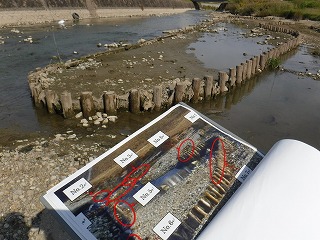 | 瀬戸川に設置された木杭の腐朽調査 10月29日 卒業研究テーマに関する調査を実施しました。 |