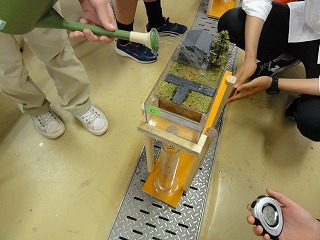 | 公開講座「グリーンインフラで浸水から街を守る仕組みを学ぼう」 5月28日(土) 公開講座「グリーンインフラで浸水から街を守る仕組みを学ぼう」を令和4年5月28日(土)に開催し、中学生12名と保護者の方が参加してくれました。本講座では、洪水氾濫、内水氾濫の仕組みを理解し、同じ降水量でも地表面の状態により土地にあふれ出す水の量が違うことを実験を通じて学習するものです。実験ではコンクリート、農地、森林などを模した地表面模型を使って、雨水の流出時間と流量を測定します。計算の演習に苦戦する参加者もいましたが、実験では他のメンバーと協力しあって楽しく取り組んでもらえました。公開講座を通じて水害に関する知識と土木工学への興味を持ってくれたら幸いです。 |