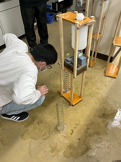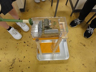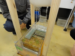 | 公開講座「グリーンインフラで浸水から街を守る仕組みを学ぼう」 10月15日(土) 公開講座「グリーンインフラで浸水から街を守る仕組みを学ぼう」を令和4年10月15日(土)に開催しました。降水量と流出量、降水量と流出までの時間の関係を正確にグラフにできるようにジョウロではなく一定の雨を降らすように工夫したのですが、後もう一歩です。担当する学生さんのアイデアに期待します。 |
