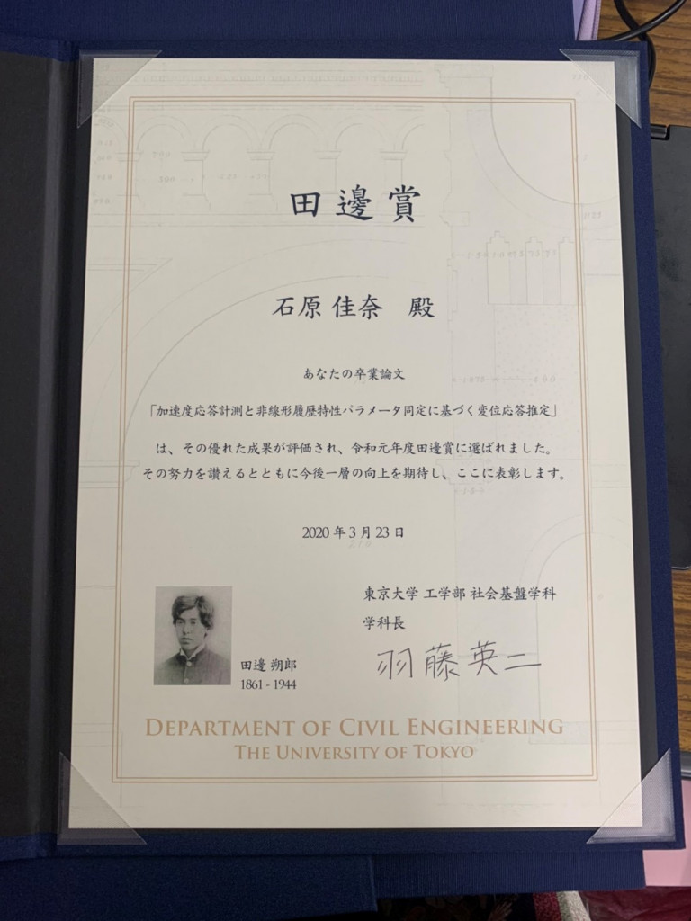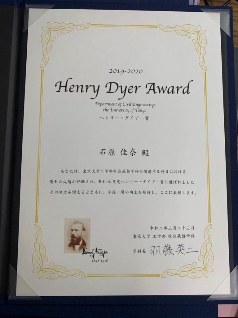 明石高専都市システム工学科を卒業した石原佳奈さんが,東京大学工学部社会基盤学科にて,成績上位者に贈られる「ヘンリーダイヤー賞」と,発表内容が優れ,発表方法が適切で,論文の質が高いものに対して贈られる「田辺朔郎賞」を受賞しました.おめでとうございます.
