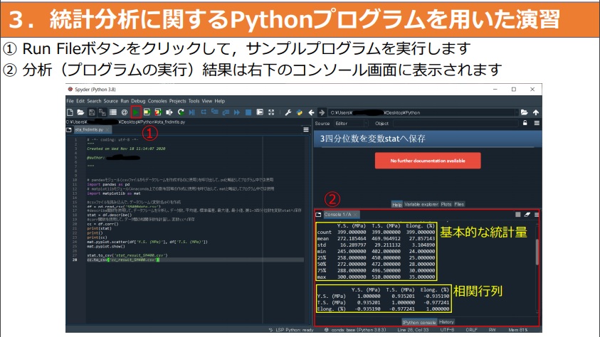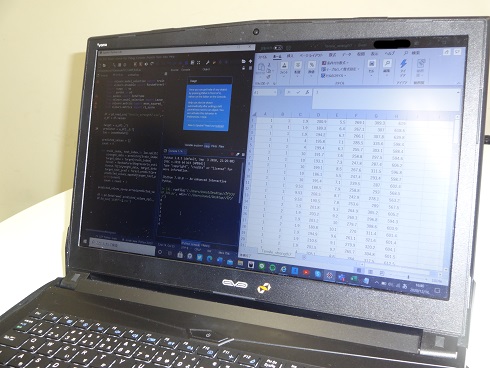 一番上の写真は,卒業研究として,AIを活用して鋼材の強度を他の材料特性値から推定しているところです.上から二番目の写真のように,AIに関するPythonで書かれたプログラムは,ノートパソコンにインストールされたANACONDAに含まれている統合開発環境のSpyderで編集や実行ができます.上から三番目の写真は,パソコンの画面を写したもので,分析に使用するステンレス鋼の強度や材料特性値に関するデータを編集しているところです.上から四枚目の写真は,機械学習と呼ばれる方法を使ってデータを分析しているところです.分析にはパソコンを使用しますが,複雑な計算のため,少し時間がかかります.