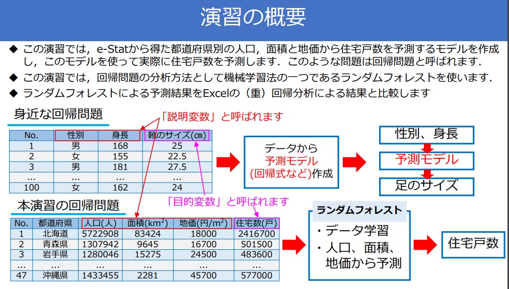 都市システム工学科では,このような動きを見据えて,AIやIoT技術の土木分野への活用に関する教育や研究を進めています.一番上の画像は,専攻科の学生が作成したAI学習用の資料の一部です.AIやIoTの開発に多用されている,プログラミング言語Pythonの実行環境ANACONDAのパソコンへの構築と,Pythonで書かれたプログラムとサンプルデータを用いた簡単な統計分析について説明しています.また,機械学習と呼ばれる手法を使った,都道府県別の住宅戸数の予測が演習できるように,上から二番目の画像のような資料とともに,サンプルプログラムとデータも専攻科の学生によって作成されています.これらの教材は,高専の学生のみならず,広く土木構造物の維持管理(メンテナンス)に携わる技術者にも活用していただくため,下記の舞鶴工業高等専門学校のiMec(社会基盤メンテナンス教育センター)のホームページで無料公開しています.