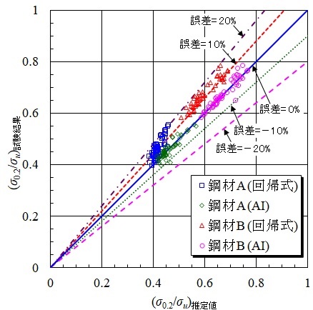 推定結果として,一番下のグラフは,2種類の鋼材(鋼材A,鋼材B)について,縦軸には学習に使用した強度の試験結果,横軸にはAIによって推定された強度をとって,推定結果を示しています.グラフ中の青色の□シンボルは,従来の回帰分析と呼ばれる方法で得られる回帰式を用いた,鋼材Aの強度に関する推定結果,赤色の△シンボルは同じく鋼材Bの強度に関する推定結果を表しています.緑色の◇シンボルはAIを用いた鋼材Aの強度の推定結果,桃色の〇シンボルは同じく鋼材Bの強度に関する推定結果を表しています.さらに,このグラフの中には,試験結果に対する推定値の誤差がそれぞれ±10%,20%と0%を表す直線を引いています.つまり,青色の線上にシンボルがある推定値は誤差がなく,試験結果と推定結果が一致することを意味しています.このグラフから,緑色と桃色のシンボルで表されるAIによる推定結果は,誤差±10%を表す緑色と赤色の線に挟まれた領域にあります.それに対して,青色と赤色のシンボルで表される回帰式による推定結果の多くは,誤差20%を表す紫色の線と誤差10%を表す赤色の線に挟まれた領域にあります.このことから,従来の方法に比べてAIは高い精度で強度を推定できることがわかります.