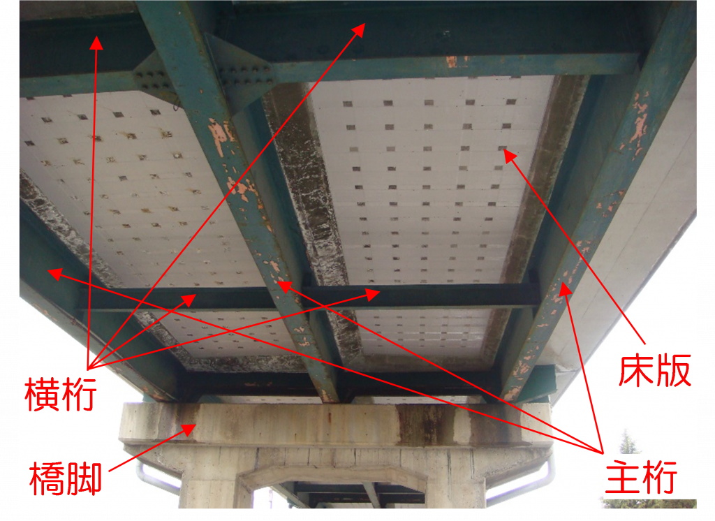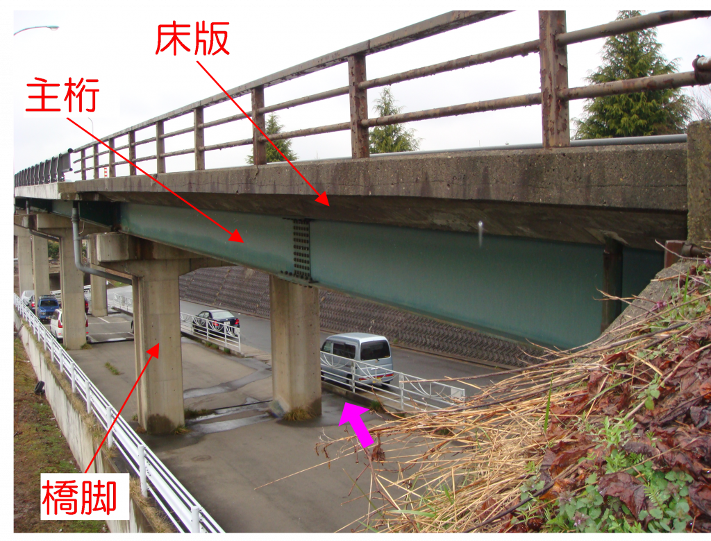 一番上の写真は,Hビーム橋の側面を写したものです.この橋の下から,写真に示しているピンク色の矢印の方向に写したものが上から2番目の写真です.この写真のように,Hビーム橋は,橋の床部分に相当する鉄筋コンクリート製の床版(しょうばん)を鋼製の主桁(しゅげた)で支え,主桁の間には複数の主桁で一体となって橋を支えるための横桁(よこげた)が取り付けられています.床版の上面には舗装が敷かれて自動車や歩行者が通行します.プレートガーダー橋と呼ばれる一般的な鋼製の橋では,補剛材(ほごうざい)と呼ばれる多数の鋼板が主桁に溶接され,構造が複雑であるのに対して,Hビーム橋は小規模な橋に適用され,その主桁には殆ど補剛材が取り付けられないため,構造が簡素で,点検,保守しやすいといった特徴があります.