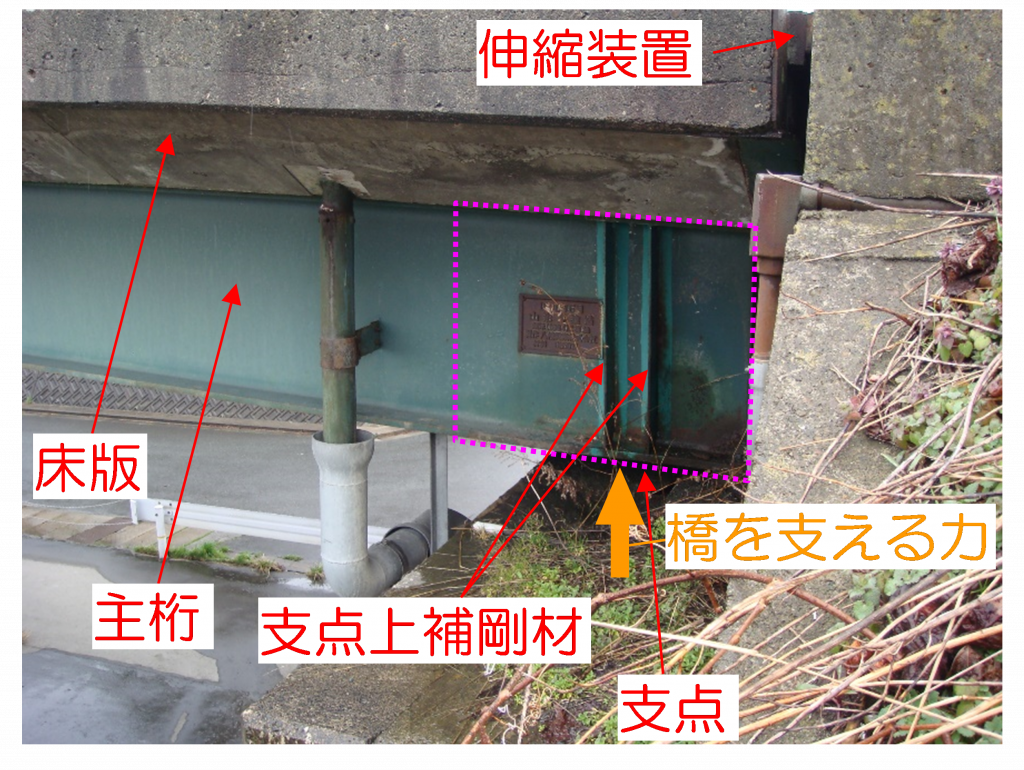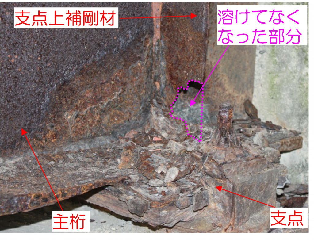 上から3番目の写真のように,Hビーム橋に限らず,一般的に橋の端部は,温度変化による橋の伸縮変形を吸収するための隙間を設けて,伸縮装置が設置されます.同時に,この隙間は,盛り土など,他の道路構造物との境界となるため,一般的に構造上の弱点とされています.伸縮装置の付近には,橋を支える支点と,支点上の強度を増すために,その直上の主桁には支点上補剛材が溶接されます.支点部は橋に作用する力を地盤に伝える重要な箇所であるにもかかわらず,日ごろの手入れが疎かになると,劣化した継目部分から雨水や土砂が流れ込んで支点部に堆積し,上から4枚目の写真に示しているように,腐食が発生します.鋼材の腐食は,人間の虫歯と同じような現象で,その部分は溶けてなくなるため,構造物の強度が低下する要因となります.