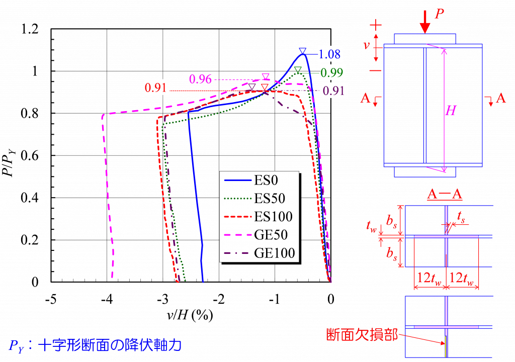 上から8枚目の図中のグラフは,実験から得られた力Pと力の作用方向の変位vの関係を示しています.Pは降伏軸力と呼ばれる力PYで割り,vは模型の高さHで割っています.図中の▽はP/PYの最大値を表しており,それぞれの模型が耐えることができた最大の力を表しています.つまり,この値が大きいほど,強度が高いことを意味します.グラフ中の凡例のES0は,断面を削り取っていない模型の結果を示しており,5つの模型の中で最も高い強度1.08を示しています.ES50,ES100はそれぞれ支点上補剛材下部を板の厚みの50%,100%削り取った模型の結果であり,最大値は0.99,0.91を示しています.GE50,GE100はそれぞれ主桁の桁端側を板の厚みの50%,100%削り取った模型の結果であり,最大値は0.96,0.91を示しています.したがって,削り取った断面積が大きいほど強度が低下していることがわかります.