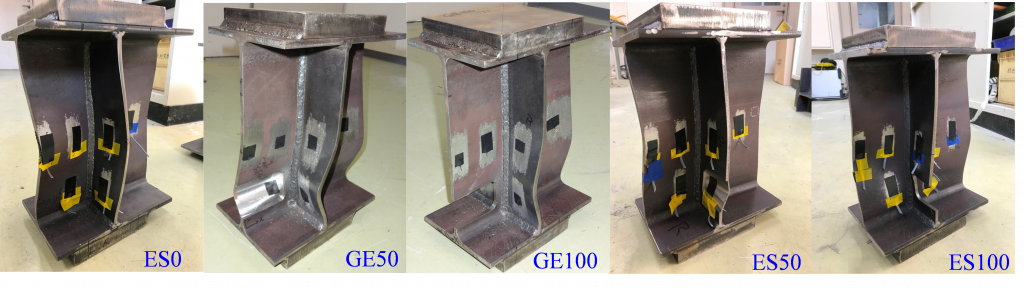 Hビーム橋は,市町村が管理する小規模な橋にも採用されており,近年,上から4枚目の写真のように,主桁端支点部での腐食の発生も報告されています.市町村は厳しい予算制約下でこの種の橋の合理的な修繕計画を立てる必要に迫られており,そのためには,主桁端支点部が腐食した橋の強度を明らかにする必要があります.そこで,この研究では,上から3枚目の写真のピンク色の点線で囲って示す支点部に着目して,上から5枚目の写真に示すような模型を5つ製作しました.そのうち4つには,上から6つ目の図に示すように,腐食に見立てて断面を削り取る加工を行いました.この図の中に灰色で示すように,削り取る箇所は,主桁の桁端側と,片側支点上補剛材で,それぞれ板の厚みの半分を削ったものと,全て削り取ったものを準備しました.そして,上から7枚目の写真のように,それぞれの模型を万能試験機と呼ばれる機械に挟んで力を作用させることによって強度を調べました.