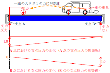 橋や送電鉄塔,パイプラインなどの構造物を支える箇所(支点)には,構造物の自重(死荷重)や自動車の重さ,風圧などによって力が発生します.専門的には,この力は支点反力(してんはんりょく)と呼ばれています.橋の支点部の周辺は,支点反力を用いて設計されます.さらに,橋の場合には,自動車や列車が通行するため,時々刻々とそれらによる力の作用点や大きさも変化します.このため,力の作用位置によって支点反力も変化することになります.