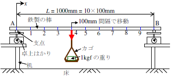この実験装置は,上から二番目の図に示すように,両端の机の上に,支点反力が計測できるように卓上はかりを設け,さらにその上に支点を介して鉄製の棒を載せたものです.鉄製の棒は橋のけたに相当し,事前にその重さを計測するとともに,支点のA,Bからそれぞれ100mm間隔で線を引き,それらを点1~9と名付けています.そして計量されたカゴに1キログラムの重りを載せ,このカゴをそれぞれ100ミリメートル離れた点1~9まで移動させて,A点とB点に設けた卓上はかりの値を読み,データシートに記録します.