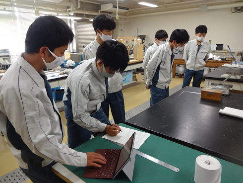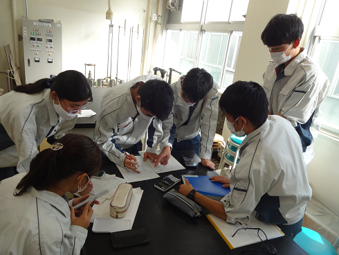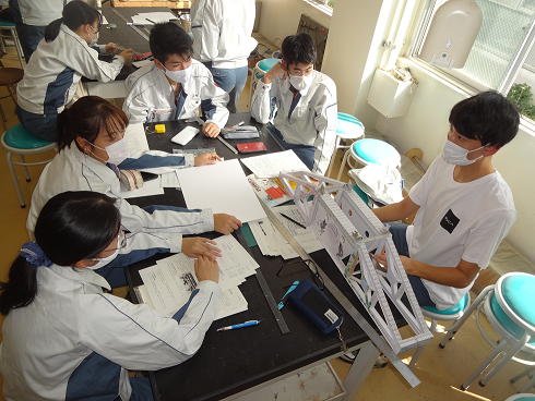 次回の実験は,指定された制約条件の範囲内でケント紙を使用して橋けたの模型を設計,製作し,その強さと軽量性を競うものです.今回の実験では,使用できる実験装置が1台しかないため,学生たちは待ち時間を利用して,次回の実験で製作する橋けたの模型の設計について話し合いをしました.