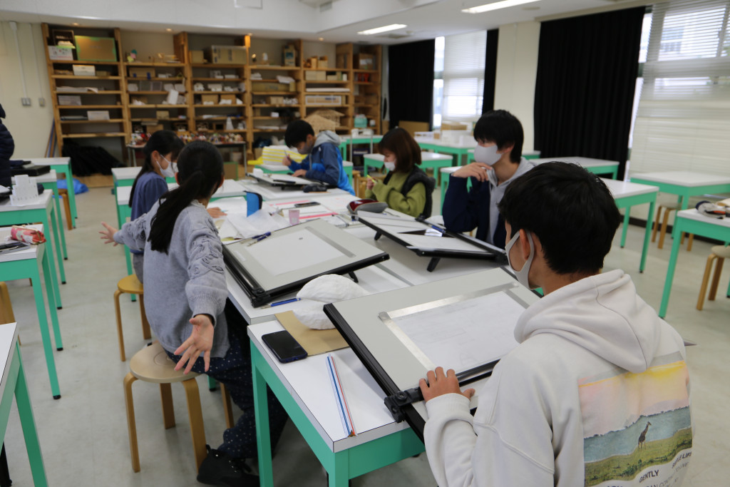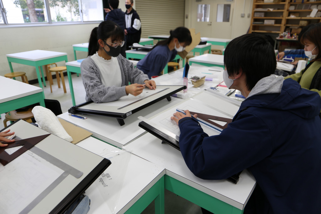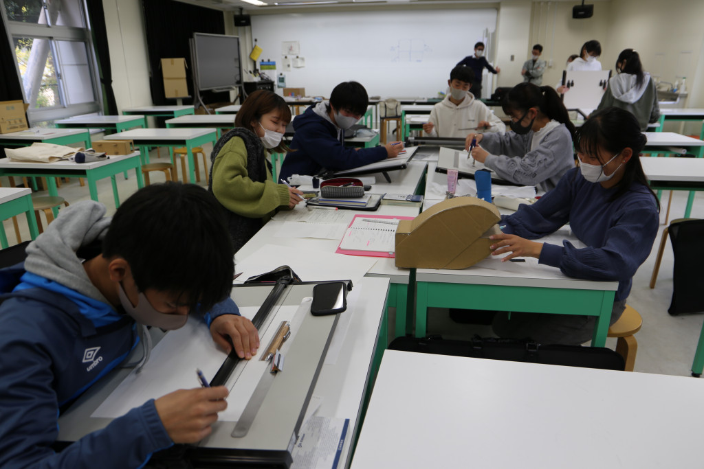 設計を始めてまだ数ヶ月の1年生の皆さんですが、机を寄せ合って製図道具を器用に使いながら上手に設計しています。さて、今年は一体どんな作品が出来上がるのか、今から楽しみです。